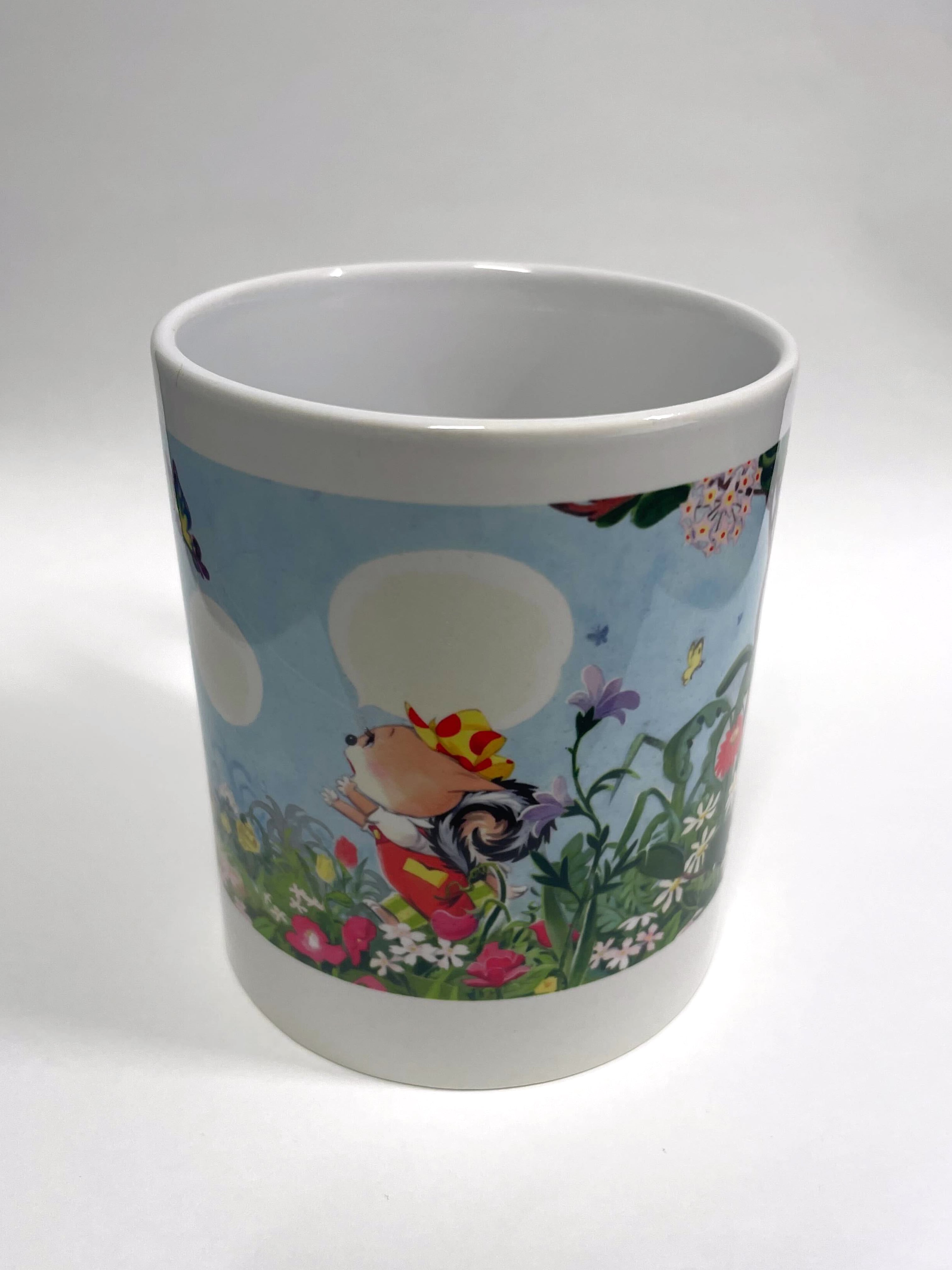 お花畑の中で蝶を追いかける愛らしいぽっこちゃんがデザインされたマグカップです。